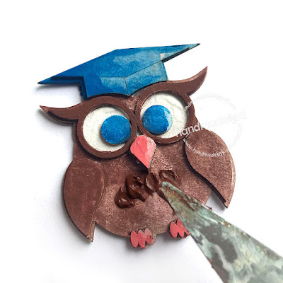 Malujemy oczy, dziób, pazurki i biret (z łaciny birretum,) - czapeczkę sówki.
